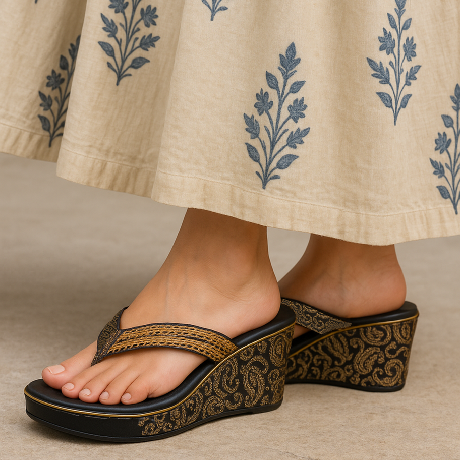 - Festive Elegance – Golden finish with ethnic paisley design on the wedge.