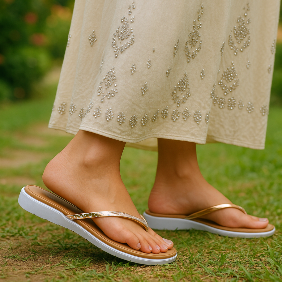 - Elegant Design: Features a chic metallic and crystal-embellished thong strap for a modern, stylish look.